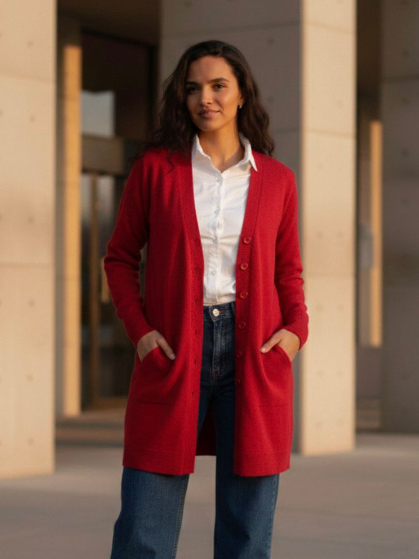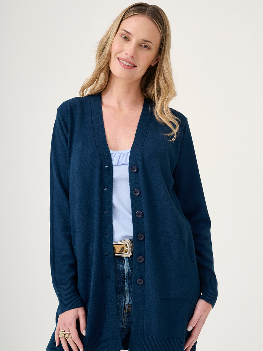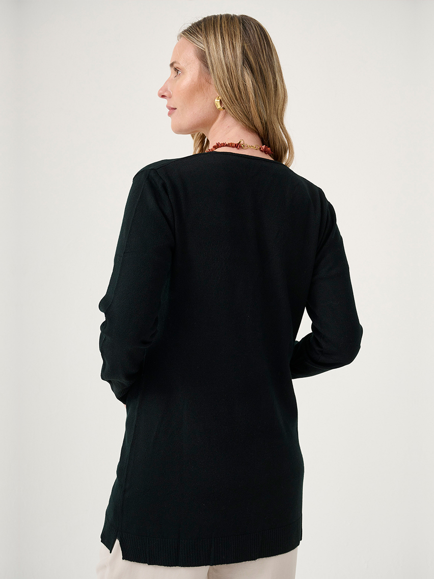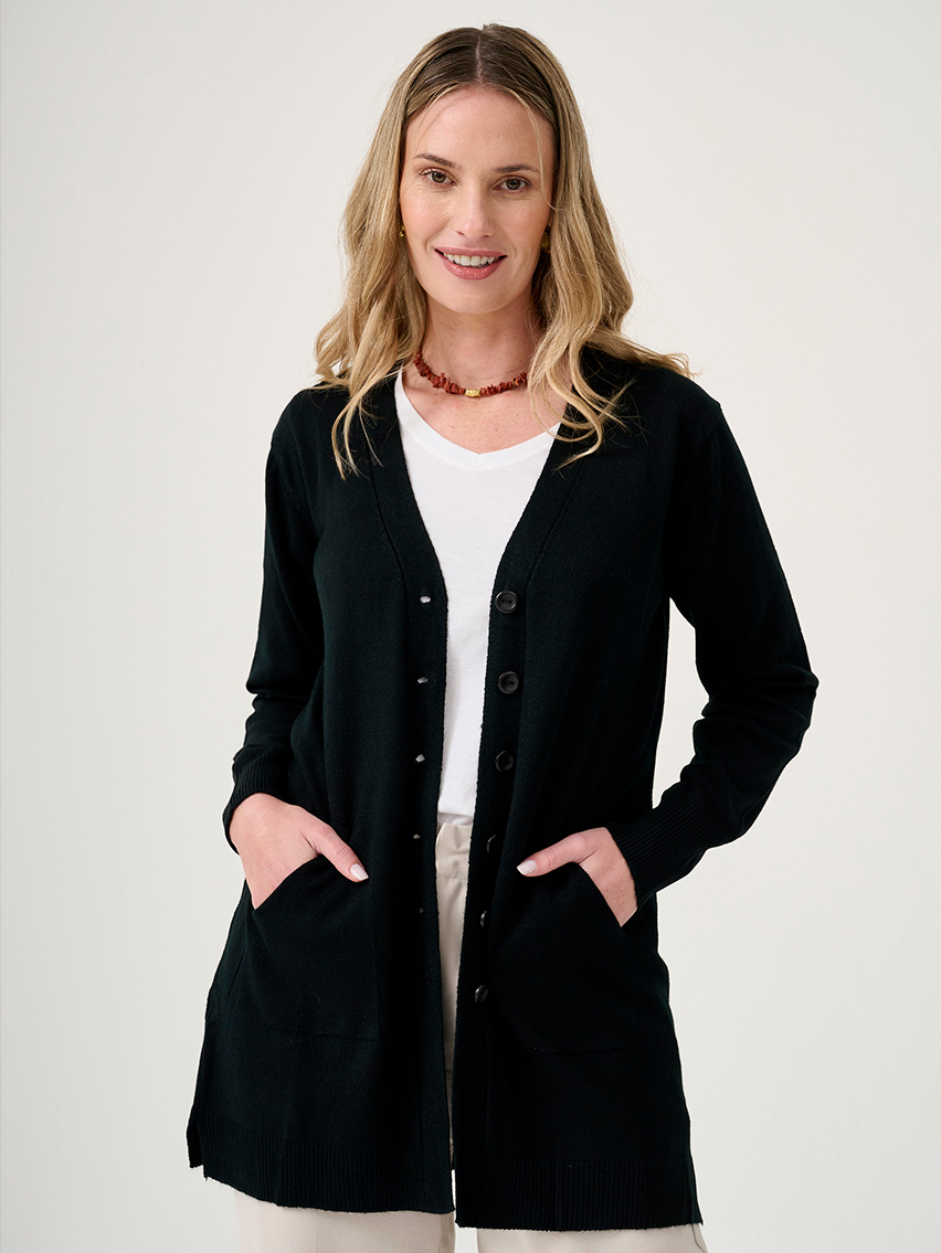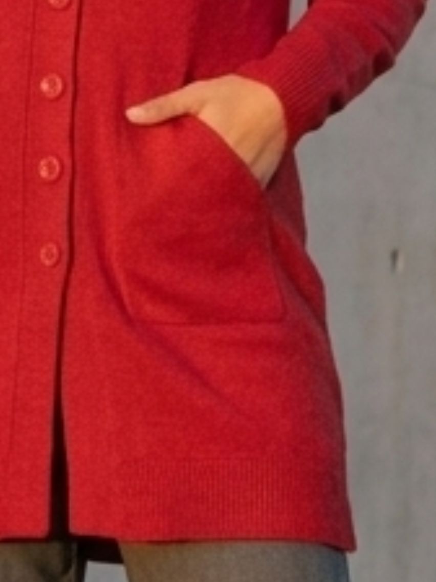 Saquito largo, con bolsillos. Detalle de tajos en los laterales.