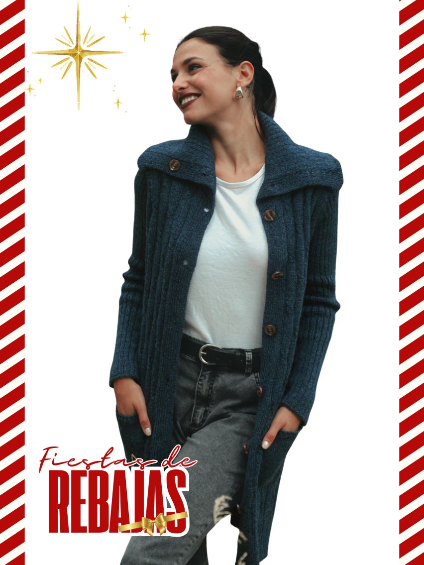 Cárdigan con cuello chomba, tajo y bolsillos en laterales.