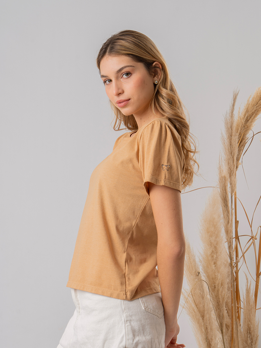 Remera manga corta fruncida y bordado de mariposa con brillos en manga izquierda.