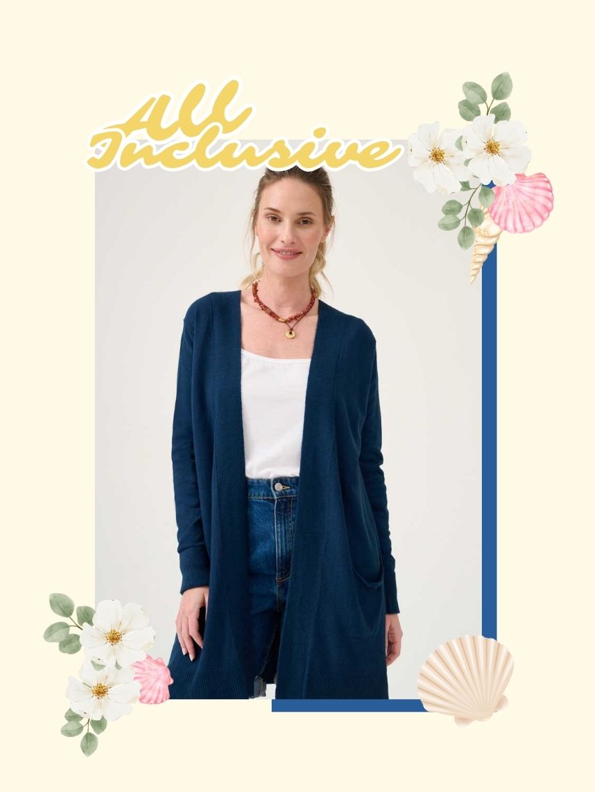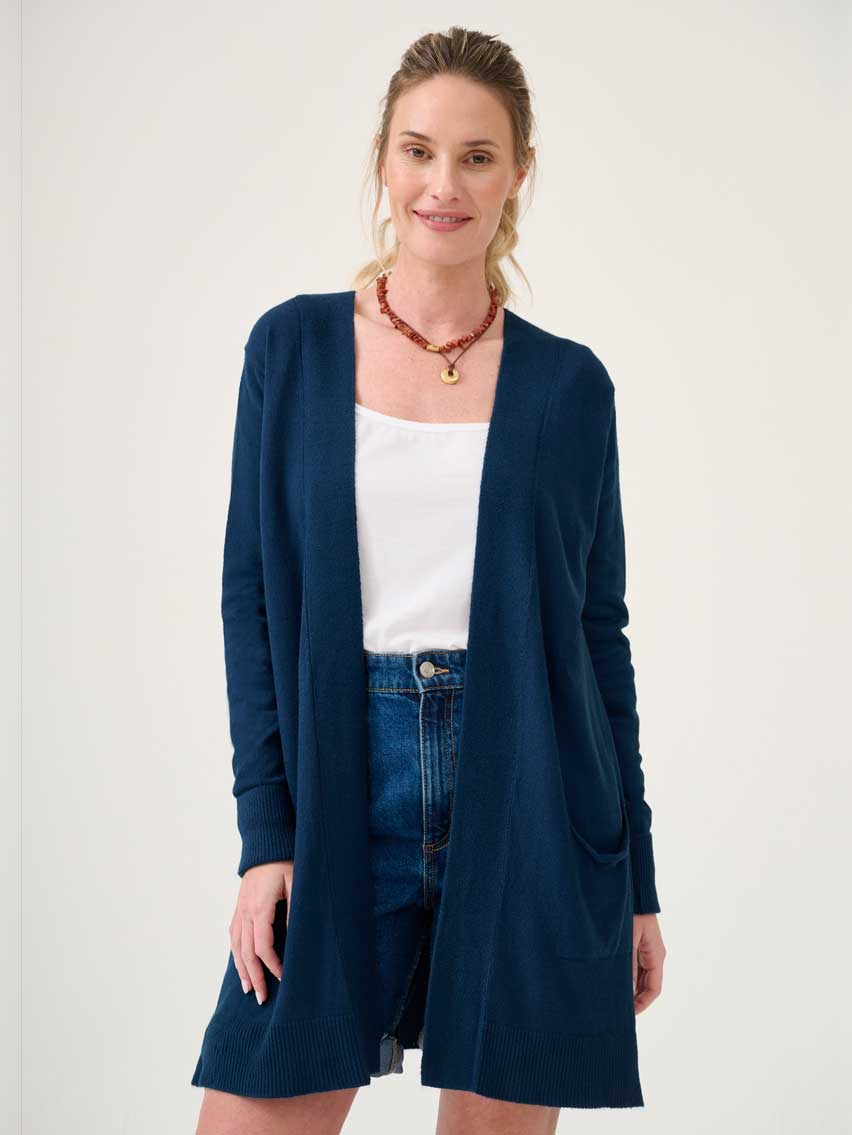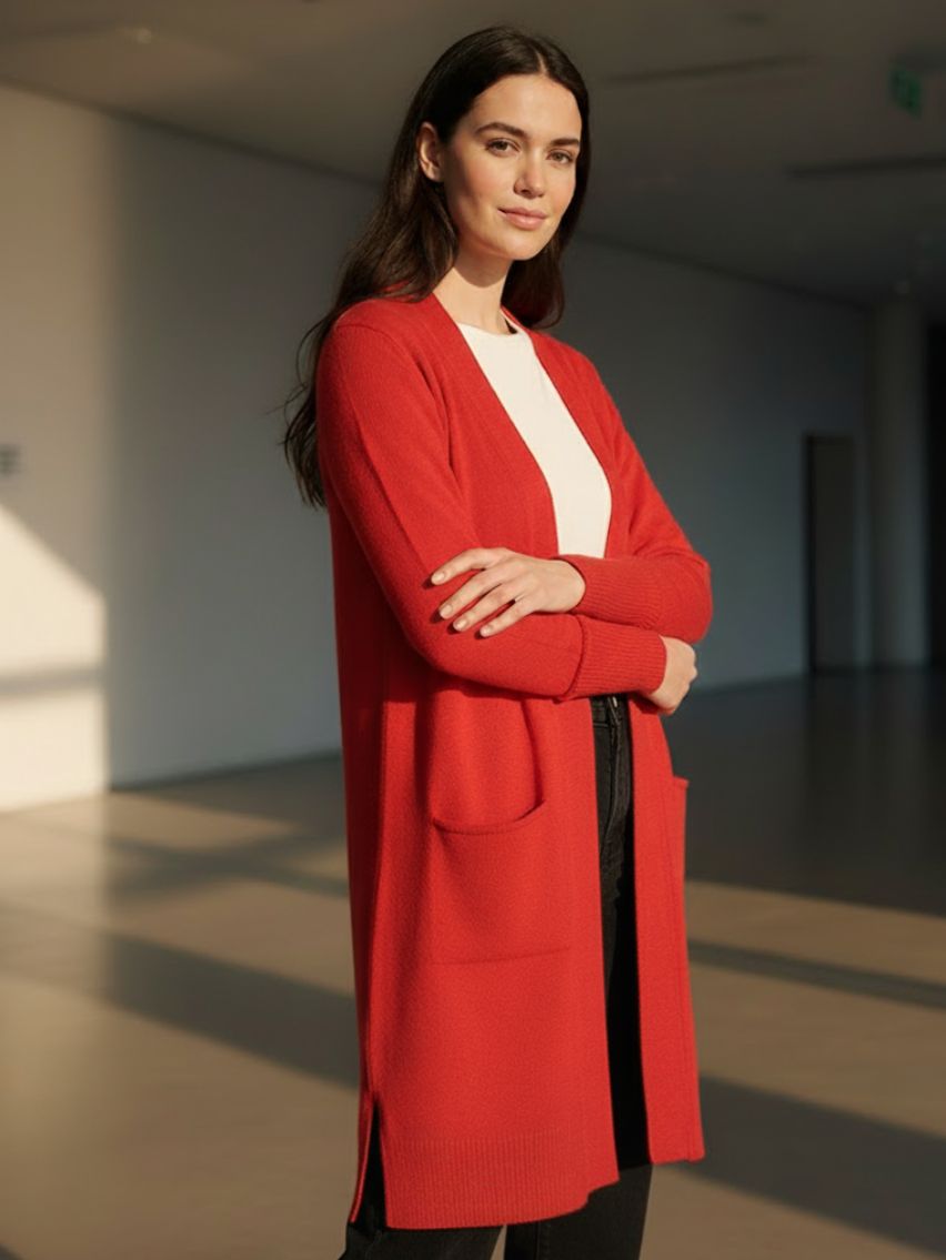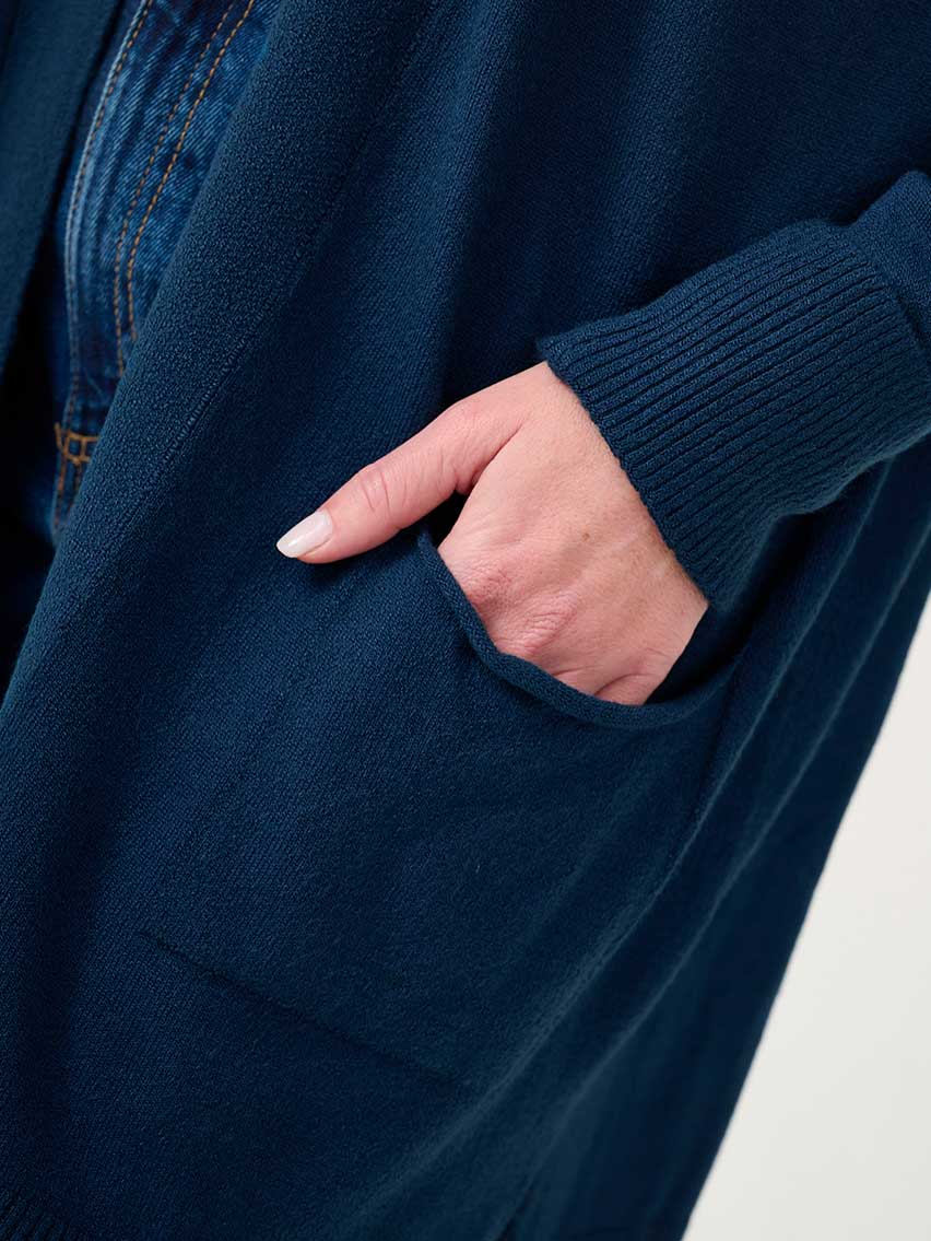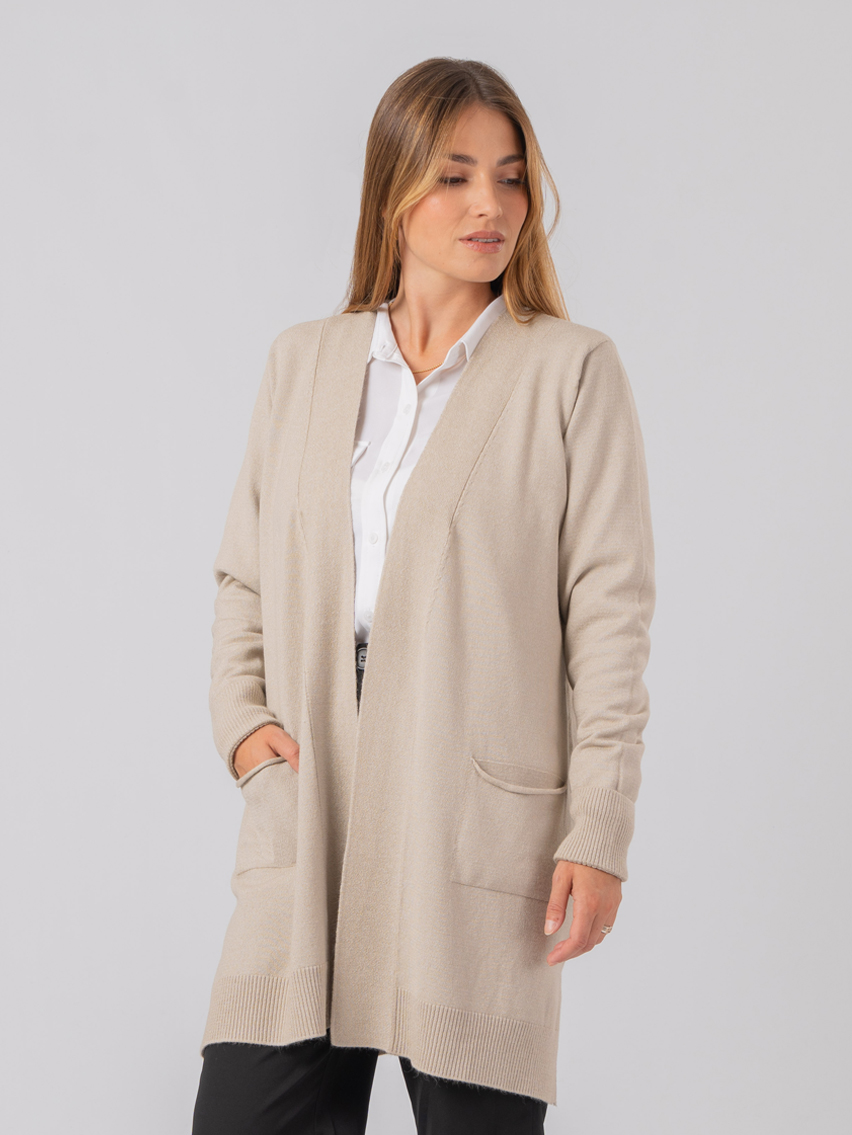 Saco largo abierto con bolsillos y tajos laterales. Detalle de puño doblado.