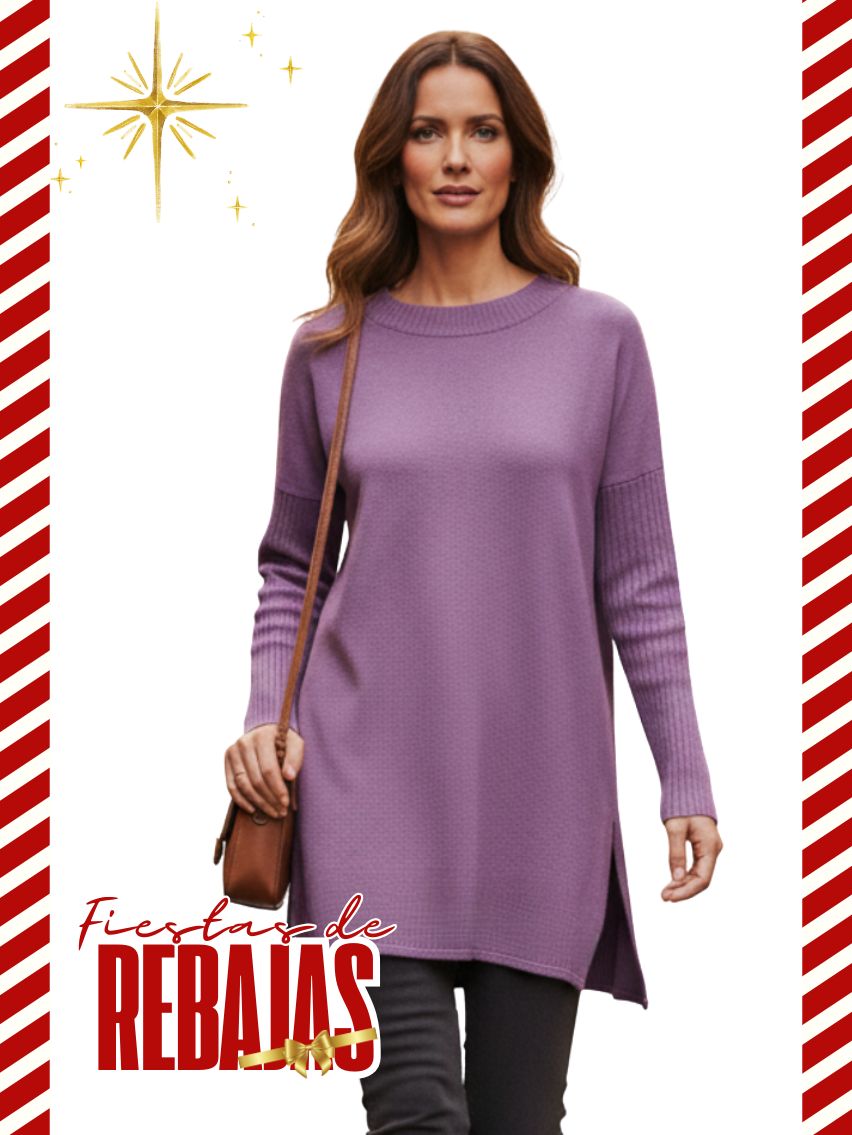 Sweater largo, cuello redondo con tajos laterales y mangas ajustadas.