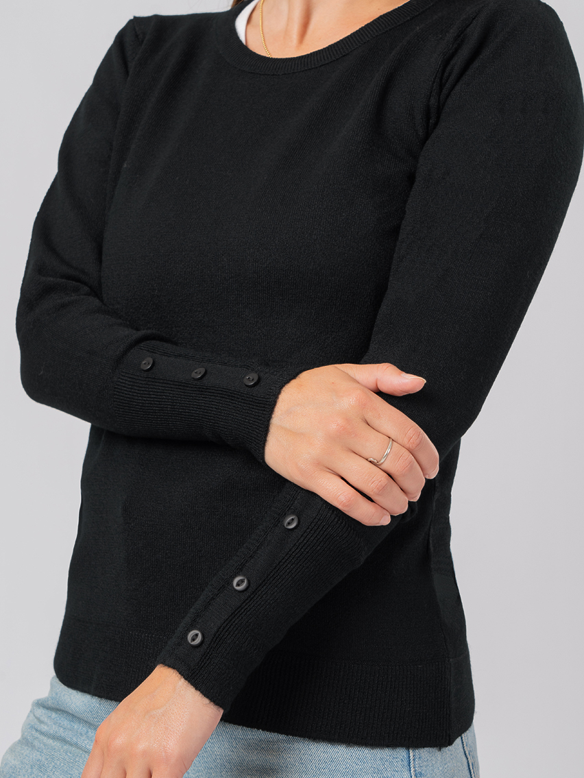 Sweater cuello redondo, puños altos. Detalle de botones en manga.