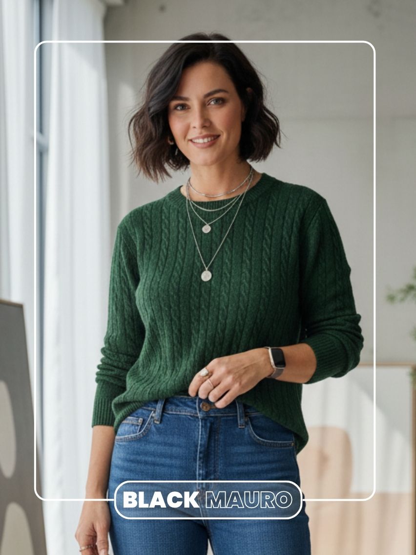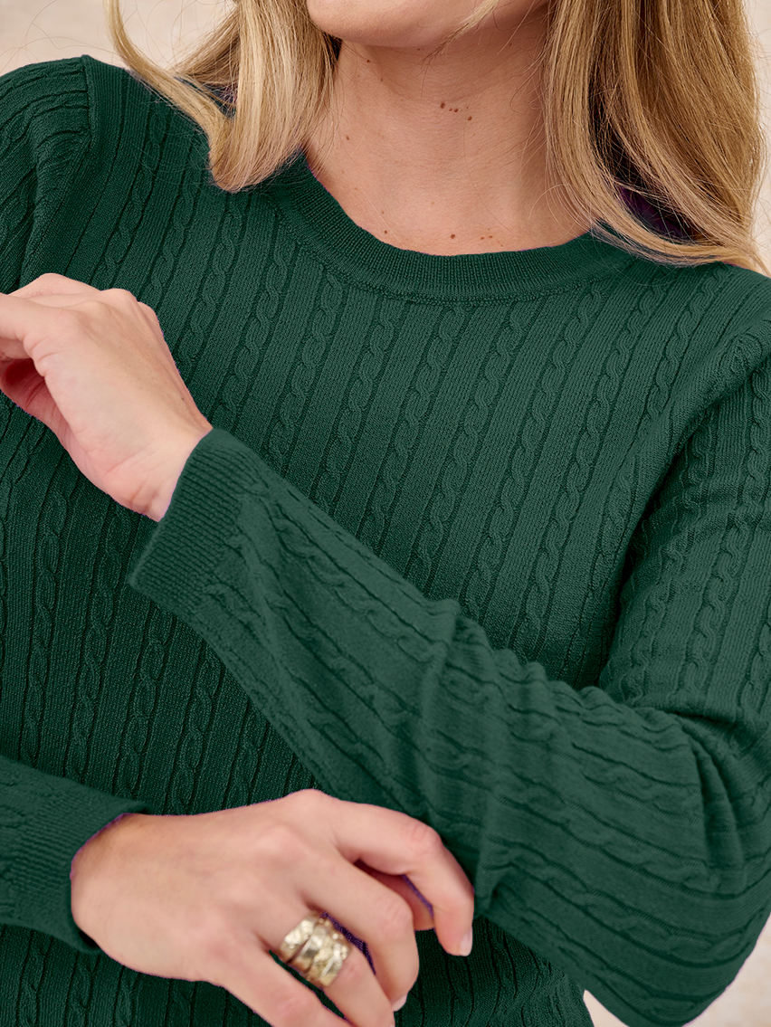 Sweater cuello redondo, tejido con trenzas y canelones.
